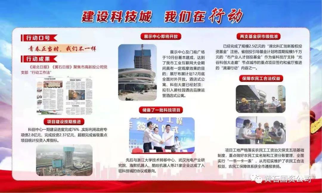 市高新投黨支部隸屬于市國資公司黨委,自成立以來,該支部全面推行“行動支部”工作法:支部工作在工地、黨員活動在工地、作用發(fā)揮在工地,將黨的建設與項目建設結合起來,以“服務黃石打造創(chuàng)新活力之城”為行動方向,以“又好又快推進省級重點項目科技城科創(chuàng)中心建設”為行動目標,以“項目攻堅”為行動主題,以“青春正當時,我們不一樣”為行動口號,創(chuàng)新開展“1+1”黨員攻堅、抗洪搶險行動和“筑堅強堡壘·建過硬隊伍”能力提升活動,建立黨員攻堅突擊隊,設置黨員示范崗,激勵黨員積極投身干事創(chuàng)業(yè)活動。